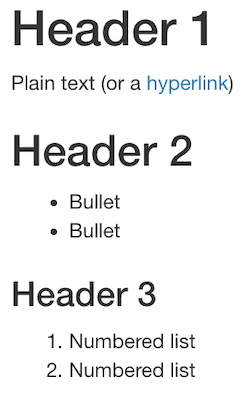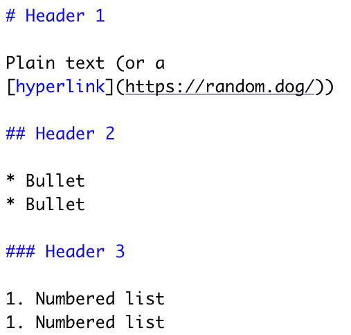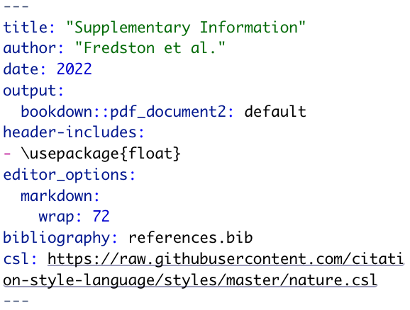 class: center, middle, inverse, title-slide # Authoring websites, documents, and more with Markdown ## SORTEE Webinar ### Alexa Fredston ### September 14, 2022 --- class: inverse center middle # Welcome! -- I'm glad you're here. --- # Why am I here? ### To learn (or learn more about) markdown A beautiful, flexible language for formatting plain text — into a website, a PDF, a slide deck (like this one!), a book, a report, or just legible code. --- # Who is this for? Anyone who wants to improve the way that you format and share your work — whatever that means to you. --- # Alexa Fredston .pull-left[ - Postdoctoral associate, Rutgers University, New Jersey, USA - Quantitative marine ecologist - Treasurer of SORTEE - Inclusive teaching of coding, etc. - afredston on [Twitter](https://twitter.com/AFredston) and [GitHub](https://github.com/afredston) ] .pull-right[  ] --- # Outline 1. Introduction 1. Documents 1. Code 1. Slides --- # Tell me about you [https://pollev.com/alexafredston045](https://pollev.com/alexafredston045) --- # What is Markdown? - A language for formatting text with a plain text editor - Designed to be readable in its raw form - Similar to LaTeX, but more “lightweight” and better integrated with analyses - Language agnostic; .md files can be opened by most code editors - We will be editing .Rmd files from RStudio today, but that doesn't actually require any R knowledge! --- # What does this have to do with open science? Using Markdown to generate publications, reports, websites, etc. will: * Make dynamically updating them with new results easier * Reduce errors from manually entering results * Create new venues for science communication Using Markdown to organize your code will: * Allow you to organize and annotate your analyses * Make it easier for others to tell what you did, aiding reproducibility --- # Cool Markdown examples An entire scientific manuscript [marine protected areas](https://github.com/DanOvando/population-effects-of-mpas) or [matrix population models](https://github.com/BruceKendall/MPM-errors) A [dynamically updating CV](http://nickstrayer.me/datadrivencv/) A [RMarkdown tutorial ... written in RMarkdown](https://allisonhorst.github.io/udm-rmarkdown/) 🤯 A [website collaboratively authored in RMarkdown](https://thefaylab.github.io/lab-manual) An [entire course](https://damariszurell.github.io/CLEWS-EDB/) --- # Today's learning objectives By the end of this tutorial, I expect that you will be able to: * Understand the different parts of a Markdown file * Recognize how the formatting of raw text in Markdown translates to the aesthetics of an output file * Generate basic PDFs and slides with code output * Understand how Markdown can facilitate open science goals * Know where to go to get help or learn more --- # The architecture of Markdown ### 1. YAML header ### 2. Markdown text ### 3. Code chunks --- ## 1. YAML header .pull-left[ - Its own language (not markdown!) - New markdown files in R include it by default - Modify it to change some global document options (custom formatting) - Mostly going to ignore it today ] .pull-right[  ] --- ## 2. Markdown text .pull-left[ rmarkdown  ] .pull-right[ html  ] --- ## 3. Code chunks ```r ggplot(aes(x=body_mass_g, y=flipper_length_mm), data=penguins) + geom_point() + theme_xaringan() + labs(x="Body mass, mm", y="Flipper length, g") ``` <img src="index_files/figure-html/demo-intro-1.png" width="100%" /> --- class: inverse center middle # Let's get started --- # Setup Software you will need: - RStudio Packages you will need installed: - `rmarkdown` - `palmerpenguins` - `tidyverse` - `leaflet` (not crucial if you don't want to install it) Run `install.packages("packagename")` for any of these that you need to. Take five minutes to do all this, and let me know if you have issues. Throughout this workshop, you can get help by raising your hand or using the chat. --- # Get the code! This unavoidably involves a little bit of exposure to GitHub. 1. Go to [https://github.com/afredston/markdown-sortee](https://github.com/afredston/markdown-sortee) (I will also put this link in the chat) 1. Click the green "Code ▾" button and then download ZIP (unless you are comfortable enough with GitHub to clone the repository; in that case, go for it) 1. Open RStudio and then navigate to the contents of the ZIP --- class: inverse center middle # Documents --- # Authoring documents 1. Open `document.Rmd` in RStudio 1. Click "knit" at the top of RStudio (if you don't see it, be sure rmarkdown is installed, and relaunch RStudio) 1. Marvel at the glory of what you've created 1. Look line by line between the .pdf and the .Rmd documents. (The PDF will also appear in the `markdown-sortee` folder that `document.Rmd` is in, if you have trouble finding it.) 1. Change something in the document! Here are some ideas: + Edit the title, author, or date + Write some new text, and try formatting it (make it bold, a header, a bullet...) + Change the embedded photo 1. If you're familiar with these Markdown basics, try something more advanced (and any of you can do this with Google's help!) + Change the color of some text + Insert a table + Add an in-text reference to the photo + Try aligning text to the center or right, or the image to the left or right I'll give you five minutes to explore this and troubleshoot as needed. Then we'll check in, and hopefully some of you will share what you discovered. Then I'll bring the document up on my computer and give you a tour. --- # Authoring documents One fairly new feature (and one reason we're using RStudio today!) is their new [visual markdown editor](https://rstudio.github.io/visual-markdown-editing/). It's basically an ultra powerful hybrid of Markdown and Microsoft Word. But be warned, it's a little buggy if you frequently switch editing modes. People write whole books in Markdown, and this may make that seem a little more achievable. For example, the new visual editor allows [easy citation management